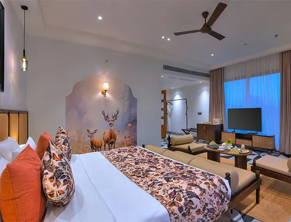 Guests can unwind in spacious interiors featuring a king-sized bed, plush seating, and large windows that open to views of the lush gardens or Aravalli hills. Enjoy modern conveniences like air conditioning, high-speed Wi-Fi, flat-screen TV, tea/coffee maker, and an attached bathroom with premium toiletries.